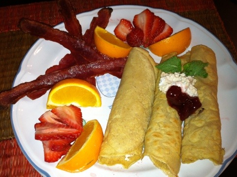 Yesterday I took a jam making class. When I woke up this morning all I wanted was to open this wonderful new jar of strawberry vanilla jam. Stuff it in French toast sounded like the perfect choice. But being gluten free makes finding good French bread hard. I decided to try and make crepes. They came out great and ended up being pretty healthy too. Check it out.