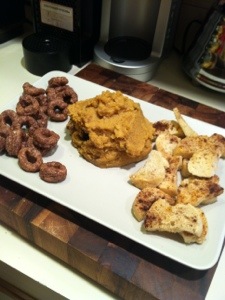 As always I continue to look for fun new ways to use pumpkin. I was trying to come up with something fun for a brunch and I figured a pumpkin spread would work great. With an idea of hummus in my mind this is what I created.