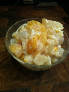 Start by draining all fruit very well. I placed it in a colander in the sink for 10 minutes. Place cream cheese and condensed milk in food processor or mixer and blend it together until smooth. Pour fruit in bowl and then pour milk mix on top. Mix it all together well and place in fridge for two hours before serving.