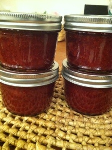 Pot 1 –Using the recipe above – In a medium size pot non-reactive surface to make the jam. Continue to stir and watch the mixture so that it continues to bubble but not burn or boil over. You must stir it every few minutes. Your goal is for the mixture to become thick. It should get to the point that it wont create droplets or run easily off a cold spoon. You are looking for a consistency that slowly forms large clumps that look almost like glass forming on the spoon. Many recipes say this will take 10-15 minutes. It took me about 45 minutes but weather plays huge factor.