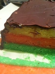 Line three equally sized rectangular baking pans with wax paper and individually pour one batter into each pan. Bake at 350 degrees for about 15 minutes utile top starts to firm and before sides brown. Remove from oven and allow to cool. After ten minutes use the wax paper to remove each layer and then place them on top of each-other. Now melt the chocolate in a bowl. Spread the chocolate over entire cake with the chocolate so that the entire thing is covered. Allow the whole thing to harden in the fridge. Then slice into square pieces.