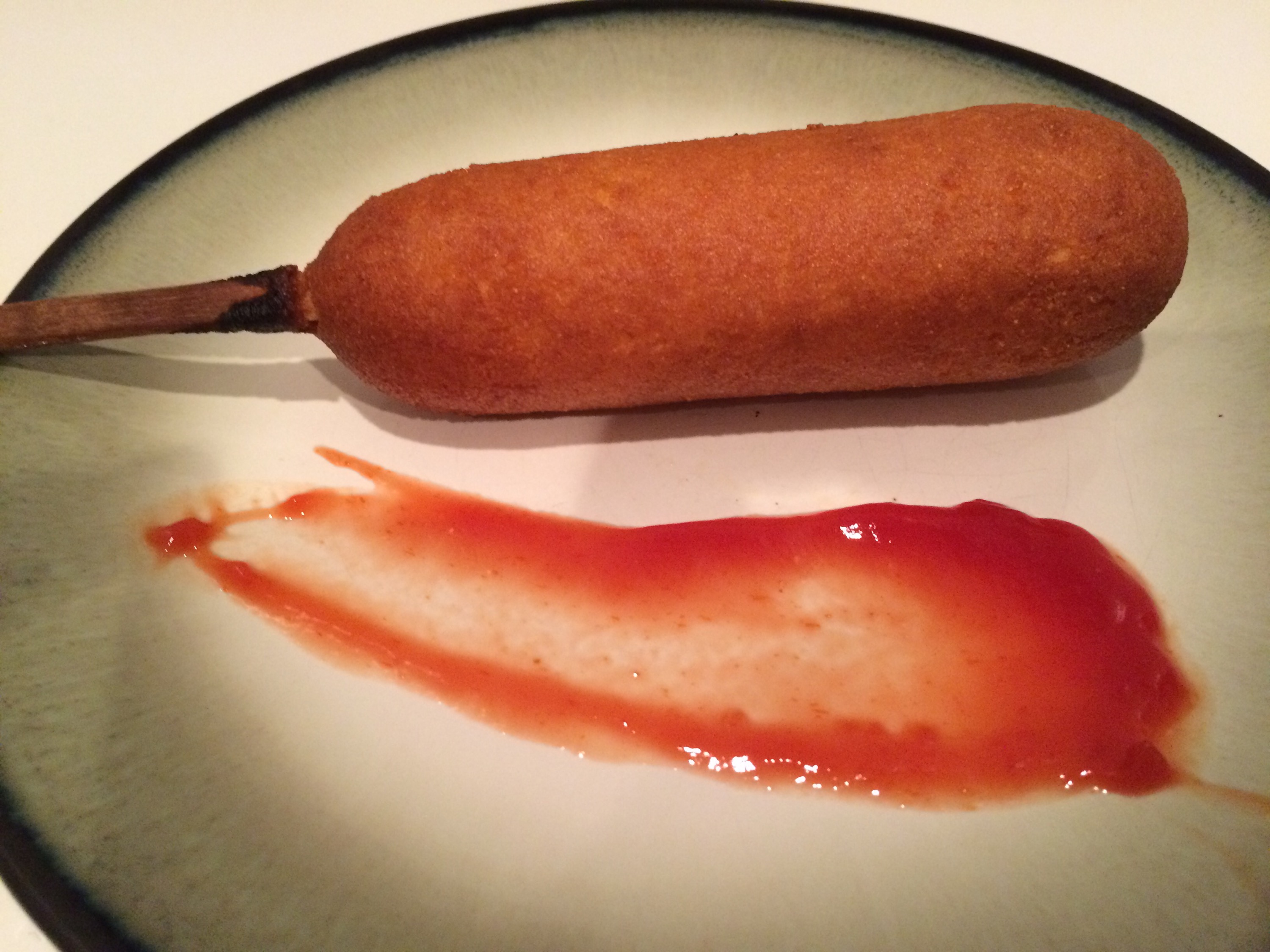 Heat the corn dog as instructed in the oven. When done, gently slide the whole corn dog off the stick. Then, slice the corn dog into 1/2 thick rounds. Serve on a platter with mustard, ketchup and other dipping.
