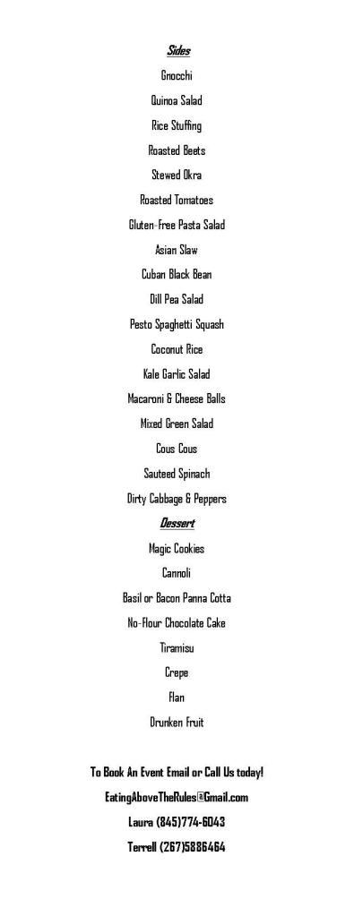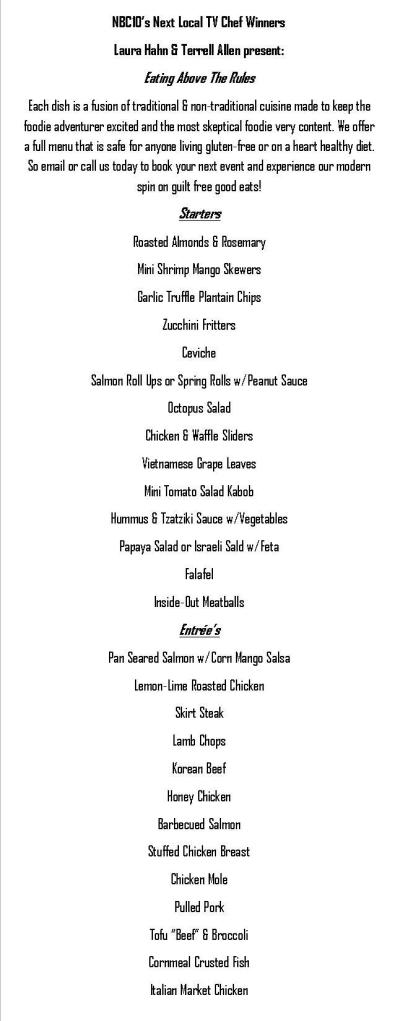 Mission- The mission for “Eating above the Rules” is to make creative and fun food that will leave all the foodies at your event impressed but with out anyone being left-out. All menu’s are customizable and can be made to cater to gluten free, dairy free, meat free or a heart healthy diets.