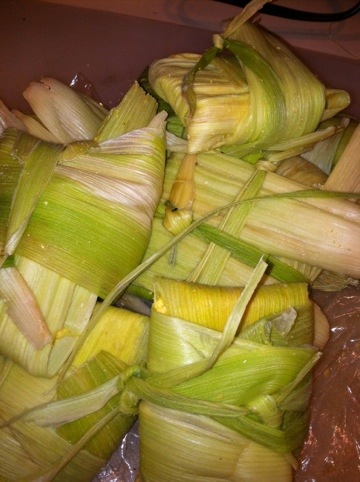 Peel the husk of the corn very carefully. You want to keep the pieces as wide as possible. Reserve all the husks. Small scraps can be used to help tie the packets together at the end.